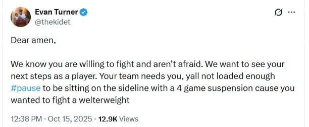 特纳:亲爱的阿门,知道你能打也从不怯场。但球队需要看到你的进阶成长。阵容深度本就不够,难道你想因为打一场羽量级格斗而被禁赛四场吗?