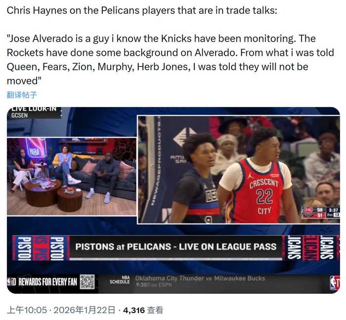 “尼克斯一直在关注阿尔瓦拉多,火箭也对阿尔瓦拉多做了一些背景调查。据我所知,奎因、费尔斯、锡安、墨菲和赫伯琼斯都不会被交易。”